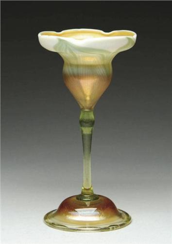 TIFFANY FLOWER FORM VASE. Green pulled feather decoration on opal background. Nice form with crimped mouth. Signed "L.C.T." together with the remnants of a sticker on the underside. SIZE: 9-1/2" t. CONDITION: Scratches and wear to interior of cup, otherwise very good to excellent. 5-62156