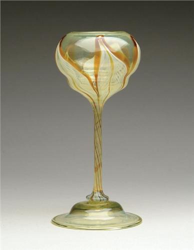 TIFFANY FLOWER FORM. Spectacular Tiffany flower form has gorgeous pulled feather design in white and mahogany. Design is done against a beautiful light amber transparent background. Applied amber foot has whispy opalescent wave design around edge. Signed on the underside "LCT 07677". SIZE: 8-3/4 in. t. CONDITION: Very good to excellent. 5-61285