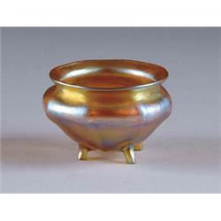Lot 844 TIFFANY FOOTED SALT Commonly referred to as a “Witch’s Cauldron” this four footed open salt is nicely ribbed and has a purple iridescence. Signed “LCT”. SIZE: 2-1/8” w x 1-1/2” t. CONDITION: Chips to one foot and feet ground. 5-70729