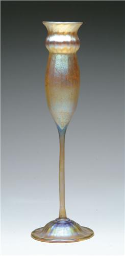 TIFFANY GOLD FLOWER FORM. Beautiful tall slender flower form has applied round foot with beautiful iridescence showing blues, greens and purples. The slender stem leads to a slightly ribbed body with bulging neck and slightly flaring lip. Signed on the underside "LCT Y7709". SIZE: 13-1/4 in. t. CONDITION: Some slight staining to the interior otherwise very good to excellent. 5-61331