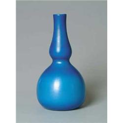 Lot 1052 TIFFANY GOURD VASE. Large Tiffany vase has double gourd design with medium blue exterior and white interior. Interior white glass has some gold swirls at the lip. Signed on the underside "LC Tiffany Inc. Favrile 275N". Evidence on the underside where previous numbers may have been ground off. SIZE: 12" t. CONDITION: Very good to excellent. 5-68797 (1,500-2,500)