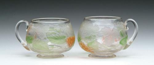 TIFFANY INTAGLIO CUPS. These spectacular Tiffany crystal cups are intaglio carved with beautifully detailed grapes, leaves and vines surrounding the entire cup. The fruit clusters and some leaves are lightly stained with green and reddish-orange. Each cup has an applied clear handle. Each cup is signed on the underside "LC Tiffany – Favrile 7459B". SIZE: 2-3/4 in. t. CONDITION: Very good to excellent. 5-61215