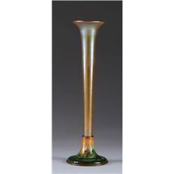 Lot 548 TIFFANY IRIDESCENT VASE Trumpet shaped vase with gold iridescence and purple highlights. Vase sets in foot with light green, dark green and orange mottled enameling. Stamped on underside of foot “Louis C Tiffany Furnaces Inc. 150” with insignia above. SIZE: 11-5/8” t. CONDITION: Minor glaze cracks at rim of base, one tiny open bubble on the side, otherwise very good to excellent. 5-70955