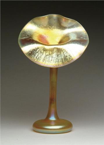 TIFFANY JACK IN THE PULPIT. Beautiful Tiffany vase has jack in the pulpit top with spectacular gold iridescence with stretching around rim and bright raspberry iridescent center. Signed on the underside "LC Tiffany Favrile 1216D". SIZE: 10-1/4 in. t. CONDITION: Very good to excellent. Collection of Dr. C. and Margaret Chastain 5-61422