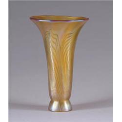 Lot 222 TIFFANY LILY SHADE Nice gold favrile lily shade has subtle pulled feather design with good gold iridescence. Shade is unsigned. SIZE: 4-5/8” l x 2-3/4” dia. CONDITION: Some minor fleabites to fitter rim, otherwise very good to excellent. 5-70895