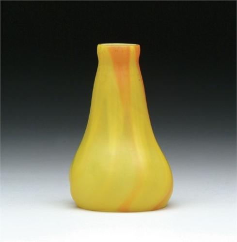 TIFFANY LILY SHADE. Rare Tiffany shade has slightly bulbous end with orange and yellow pulled design against a yellow background. SIZE: 4-1/4 in. t. CONDITION: Very good to excellent. Estate of Jon Heiden and Donald Mooers 5-60664-1235