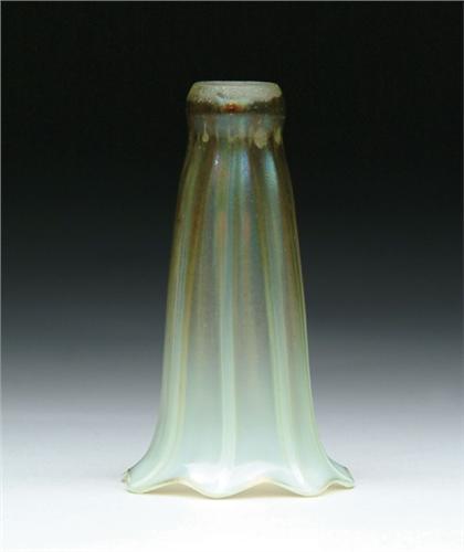 TIFFANY LILY SHADE. Wonderful Tiffany lily is amber iridescent glass shading to opalescent at the ruffled rim with opalescent vertical ribs terminating in the center of each ruffle. SIZE: 4-1/2 in. t. CONDITION: Very good to excellent. Estate of Jon Heiden and Donald Mooers 5-60664-1225