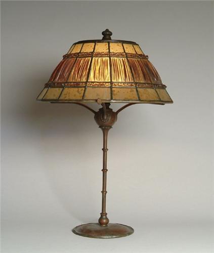 TIFFANY LINENFOLD LAMP. A truly outstanding and unusual linenfold has deep bronze amber colored glass with center ring of linenfold with a molded Linenfold border at top and bottom. This is inturn bordered by top and bottom panels of beautifully mottled glass. The very distinct and random mottling resemble oil spots. Signed on inside edge "Tiffany Studios New York 192? Pat. Appl'd For". Shade rests atop a slender bamboo type stem with three arm spider to support the shade. Base marked on the underside "Tiffany Studios New York 2568" with the Tiffany Glass and Decorating Co. logo. SIZE: Shade is 14 in. dia. Overall height is 21 in. CONDITION: A few tight hairlines in the shade, otherwise very good to excellent. 5-61335