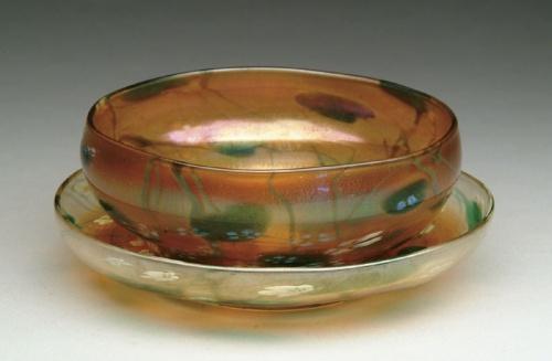 TIFFANY MILLIFIORI BOWL and PLATE. Extremely nice Tiffany bowl and underplate are done in gold iridescent favrile glass with green leaf and vine decorations along with white millifiori flowers encircling both pieces. Both bowl and plate are signed on the underside "LCT". SIZE: 5 in. dia. CONDITION: Very good to excellent. 5-61268