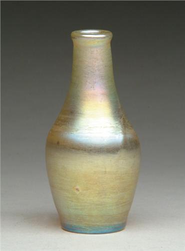 TIFFANY MINIATURE VASE. Great Tiffany vase has slightly bulbous body and nice gold iridescence with flashes of red, pink and blue. Signed on the underside "LCT W4698". SIZE: 3-1/2 in. t. CONDITION: Very good to excellent. 5-61531