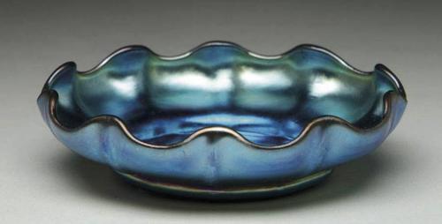 TIFFANY NUT DISH. Spectacular Tiffany nut dish has iridescent blue coloring with vertical ribbing and scalloped top. Signed "LCT Favrile" and "916". SIZE: 4-1/4" dia. CONDITION: Very good to excellent. 5-62080