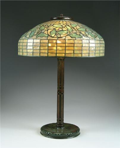 TIFFANY OAK LEAF AND ACORN LAMP. Exceptional Tiffany lamp has wonderful dichroic glass that appears green when unlit and yellow with flashes of orange when lit. The geometric apron and shade top are separated by a wide band of oak leaves and clusters of acorns. Shade is signed "Tiffany Studios 1467". Shade rests atop a wonderful Tiffany Indian base with dark brown patina and fantastic green highlights. Base is marked on the underside "Tiffany Studios New York 528". SIZE: Shade is 18 in. dia. Overall height is 25 in. CONDITION: Very good to excellent with very few if any tight hairlines. 5-61473