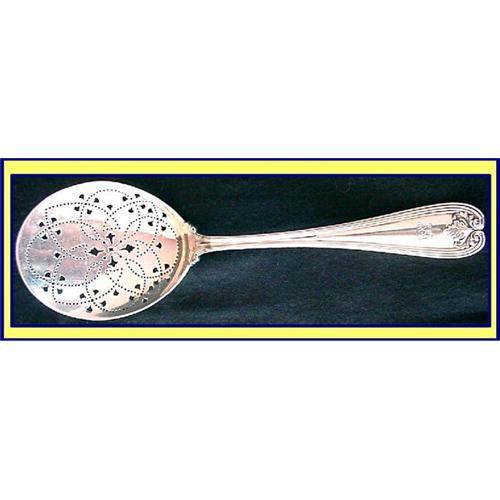 Rare Sterling silver pea / poached egg / waffle server made by Tiffany in the COLONIAL pattern. 19th century.<BR>9 1/4inches long. Weighs about 4 1/2oz.<BR>Pea server in the Colonial pattern. Round, slightly flat bowl decoratively pierced with smaller holes forming interlaced arched patterns and larger, leaf-shaped piercings forming floral arrangements. Cut out flowers in the center. The elegant handle with fluted borders and raised repousse acanthus leaves and scrolls. <BR>Back has raised: TIFFANY & CO STERLING PAT.IX95 T (T being the president of the company in the 1890's). There is a very delicate monogram with initials KMT or KMJ near the end.<BR>Excellent condition. No damage of any sort.