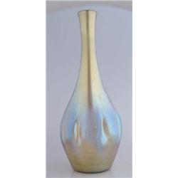 Lot 549 TIFFANY ORGANIC FORM VASE Wonderful gold favrile organic form vase has gourd shape with long neck, slightly flaring at rim. Body of vase is dimpled around its widest point. Signed on bottom "LC Tiffany Favrile 4355G". SIZE: 12-1/2" t. CONDITION: Slight staining to interior, otherwise very good to excellent. 5-70854