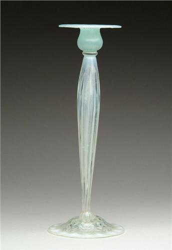 TIFFANY PASTEL CANDLESTICK. Beautiful Tiffany candlestick has mint green pastel candlecup with stretched rim and slightly opalescent ribbed body. The applied foot has white opalescent feather design and opalescent rim. Signed on the underside "LCT Favrile" and also has original paper label. SIZE: 11-1/2 in. t. CONDITION: Some fogginess to interior of stem from mfg., otherwise very good to excellent. Collection of Dr. C. and Margaret Chastain 5-61400