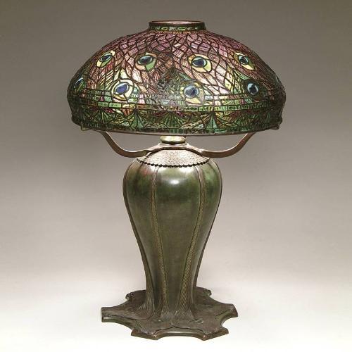 TIFFANY PEACOCK LAMP. Outstanding example of the large Tiffany peacock feather table lamp. The shade features twenty peacock eyes which are arranged in two rows that encircle the middle of the shade. Each of the eyes has sapphire-blue centers surrounded by teal and green glass which in turn is surrounded by orange and green striated glass. The upper portion of the shade is made entirely of rippled glass in a wonderful amethyst blending to orange coloration. The middle portion of the background graduates to feathers that are comprised of a soft teal green, and orange glass with just hints of purple. There are then two small horizontal rows of rippled glass in the same coloration. The apron continues on with the feather pattern in intensifying shades of teal, green, orange, and amethyst. The shade is supported by an original peacock feather base. The scalloped bottom measures approximately 12” across and is decorated with the raised peacock feather design in bronze relief with each feather having a single peacock eye made of mosaic glass. From the peacock feather design, six long quills run upwards enclosing the brown bulbous form which makes up the main portion of the base. Finishing the base, the six quills run under a stylized bronze pattern of tiny plumage and from this, three bronze arms of simple Art Nouveau styling support the shade. Both shade and base are unsigned. SIZE: Shade is 18-3/4” dia. Overall height is 25". CONDITION: Shade is slightly out of round, overall very good to excellent with a few, if any tight hairlines. The base has a deep dent at the shoulder of the bulbous portion. Base plate has many scratches that appear to be original from the factory for gluing purposes. 5-61786