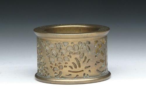 TIFFANY PEN BRUSH. Nice Tiffany pen brush has openwork grapevine pattern with carmel slag behind. Signed on the underside "Tiffany Studios New York 981". SIZE: 2-1/4 in. dia x 1-1/4 in. t. CONDITION: Pen brush insert is missing, some wear to patina. 5-61307