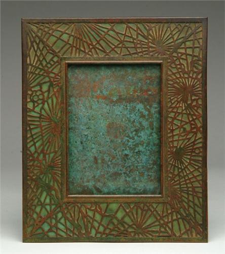 TIFFANY PINE NEEDLE FRAME. Beautiful Tiffany picture frame has openwork pine needle design backed with beautifully mottled green Tiffany glass. Frame has very lovely rich brown patina with green and red highlights. Signed on the back "Tiffany Studios New York 947". SIZE: 7-1/2 in. w x 9-1/4 in. t. CONDITION: One glass panel is cracked, otherwise very good. 5-61584