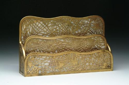 TIFFANY PINE NEEDLE LETTER HOLDER. Nice Tiffany letter holder has openwork pine needle design over carmel slag glass. Marked on the underside "Tiffany Studios New York 1008". SIZE: 10 in. w x 6 in. t. CONDITION: Glass in front panel has hairline crack, otherwise very good. 5-61256