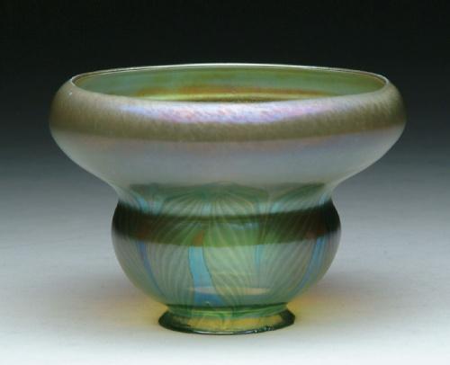 TIFFANY PULLED FEATHER SHADE. Iridescent green pulled feather shade with opalescent edge with blue iridescent interior finish. SIZE: 3-3/4 in. t x 5-1/2 in. dia x 2-1/8 in. fitter. CONDITION: Roughness to fitter, otherwise very good to excellent. Estate of Jon Heiden and Donald Mooers 5-60691