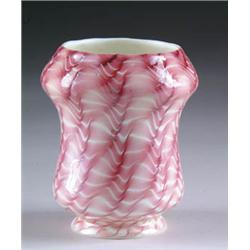 Lot 199 TIFFANY REACTIVE GLASS SHADE R#123, mauve and pink wavy marvering decoration on white, opal interior, extremely rare shade. Signed “L C Tiffany Favrile”. SIZE: 2-1/2” fitter x 5” t x 4-1/4 w. CONDITION: Very good to excellent. 5-70445