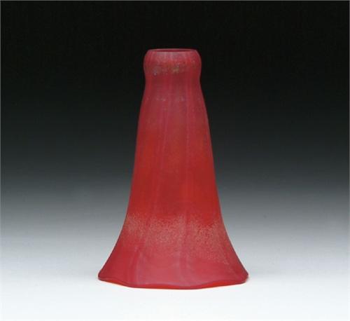 TIFFANY RED LILY SHADE. Exceptional Tiffany shade has lightly ribbed design and deep red color. SIZE: 4-1/2 in. t. CONDITION: Some exterior and interior discoloration possibly caused by heat, otherwise very good to excellent. Estate of Jon Heiden and Donald Mooers 5-60664-1226