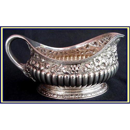 Exquisite sterling silver gravy boat made by Tiffany & Co 1891-1902.<BR>Measures 3 1/4inches high, 6 1/2inches from end to end and weighs 9.8oz.<BR><BR>Late Victorian gravy boat with very generous, round shape, fluted sides in the Georgian style with a band of repousse flowers and foliage above it, delicate leaf border and fine floral pattern on the oval foot.<BR>Marked underneath with Tiffany & Co mark, president's initial T, used 1891-1902. <BR>Condition is excellent.