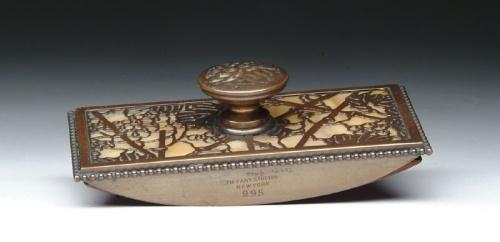 TIFFANY ROCKER BLOTTER. Nice Tiffany blotter has openwork grapevine pattern with carmel slag glass backing on both the blotter body and handle. Signed on the side "Tiffany Studios New York 995". SIZE: 5-7/8 in. x 3 in. CONDITION: Slag glass backing has two cracks, otherwise very good. 5-61163