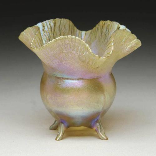 TIFFANY RUFFLED VASE. Beautiful Tiffany vase is iridescent gold with a ruffled top and four pulled out feet. Signed on the underside "L.C.T. Y3914". SIZE: 3" t. CONDITION: Minor roughness to two of the feet, otherwise very good. 5-61994