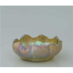 Lot 1188 TIFFANY SALT. Lovely gold iridescent salt has flashes of blue and green iridescence on ribbed body with ruffled rim. Signed on bottom "LCT W540". SIZE: 2-3/4" dia. CONDITION: Very good to excellent. 5-68790 (100-150)