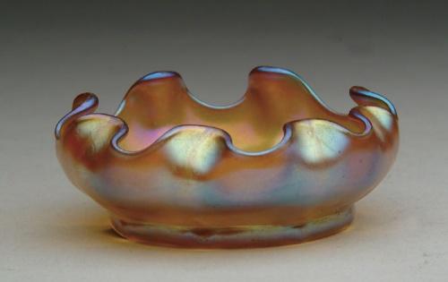 TIFFANY SALT. Gold favrile Tiffany salt has lightly ribbed body leading to ruffled rim with nice blue iridescent highlights on the edge. Signed on the underside "LCT". SIZE: 3 in. dia. CONDITION: Very good to excellent. Collection of Dr. C. and Margaret Chastain 5-61434
