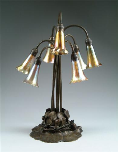 TIFFANY SEVEN-LITE LILY. Very nice Tiffany lamp has beautiful bronze base with lily pad foot and seven lily stems curving to support lily shades. Base is signed "Tiffany Studios New York 385". Gold favrile shades have nice iridescence with flashes of green, pink and blue. Six shades are signed "LCT", one "LCT Favrile". SIZE: Overall height is 21-1/2 in. CONDITION: A couple very minor chips to fitter rims, otherwise very good to excellent. 5-61489