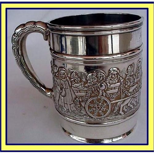 Very rare Tiffany & Co sterling silver mug with repousse frieze of a child procession with American flags and musicians and horses / ponies. Made USA 1891-1902.<BR>Measures 3 1/2inches high. Weighs 7.1oz.<BR>Cylindrical shape with crimped handle, beautifully patterned.like a dolphin / gryphon head turning and tapering in a reverse arch towards the tail.<BR>A repousse frieze around the circumference depicts a procession of Victorian children, waving American flags, riding on pony carts with musicians playing flutes and trumpets.<BR>Garlands of flowers in swags join the horses. Detail is fabulous. <BR>Front is engraved with Homer III and dated 1905. <BR>Underneath is engraved Tiffany mark with manager's initial T, indicating date between 1891-1902.<BR>Condition is very good. Close inspection shows one small ding which in no way detracts from the item.