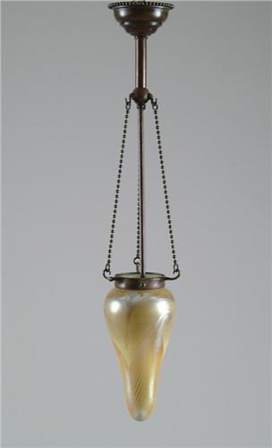 TIFFANY STALAGTITE LAMP. Beautiful Tiffany hanging lamp has wonderful gold iridescent hooked feather design against a yellow shading to gold background. Shade is suspended with three ball chains attaching it to the single socket fixture. Shade is numbered "S125". SIZE: Overall height is approx. 27 in. CONDITION: Very good to excellent. 5-60995