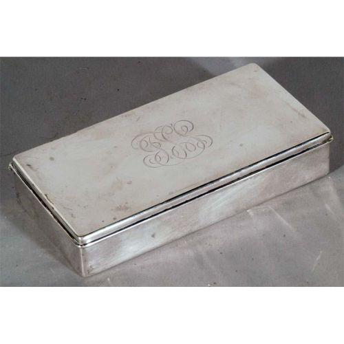 1 TIFFANY STERLING DRESSER BOX 6 3/4" x 3 1/4" x 1 1/4", with JSS monogram, 11 troy ounces, CONDITION REPORT: dings and scratches. PACKING AND SHIPPING (excluding insurance) by Fairfield Auction to points within the Continental U.S.A. and Canada (all other international must be handled by 3rd party shipper) $20.