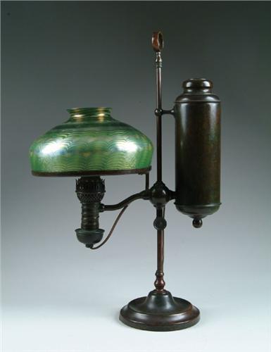 TIFFANY STUDENT LAMP. Very nice Tiffany student lamp has early bronze oil base which has been converted to electric. Base has nice brown patina and is finished with a beautiful early blown shade with platinum wave design iridescence against a rich green background. Interior bottom half of shade has white opalescence. Shade is signed inside top rim "LCT". SIZE: Shade is 10 in. dia. Overall height is 24-1/2 in. CONDITION: Very good to excellent. 5-61488
