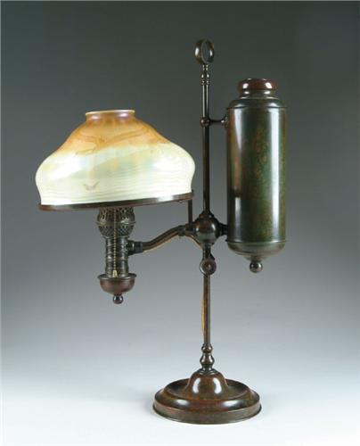TIFFANY STUDENT LAMP. Wonderful early Tiffany student lamp has simple bronze base with rich brown patina with green highlights. Base is marked on the side with applied bronze tag "Tiffany Studios New York". The early blown shade shades from rich orange at the top to cream and the bottom and has a hooked feather design extending from the top and from the bottom. Shade is unsigned and numbered "E921". SIZE: Shade is 10 in. dia. Overall height is 24-1/2 in. CONDITION: Lamp has been electrified. Shade has a few very minor nicks on bottom edge, all concealed when in place. Estate of Jon Heiden and Donald Mooers 5-60685