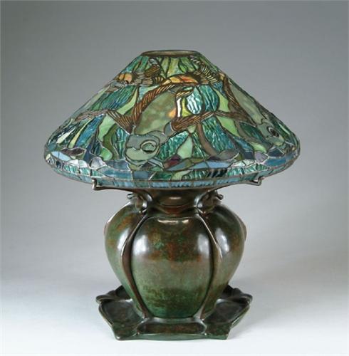 TIFFANY STUDIOS FISH LAMP. An extremely rare and important Tiffany Favrile and bronze fish lamp. A pumpkin base supports the shade, which is decorated with five fish in heavily mottled glass. The eyes of each fish are constructed of a striated/confetti type glass to give them a realistic appearance. The gills and tails have a network of filigree overlay to distinguish each fish as a separate subject against the blue to green rippled glass background that represents the water. The fish appear to be swimming in a bed of seaweed, which is represented by many shades of green and amber. The organic formed pumpkin shaped base has five arms and a single conversion socket that illuminates the shade perfectly. Keeping with the organic form, the bottom of the base is gracefully contoured to be reminiscent of lily pads. Adding to the magnificence of this wonderful piece is the stunning, allover green-brown patina on both shade and base. Shade is signed Tiffany Studios New York with a small early tag. Base is signed "Tiffany Studios New York 290". SIZE: Shade is 16 in. dia. Overall height is 17-1/2 in. CONDITION: Very good to excellent. 5-71715