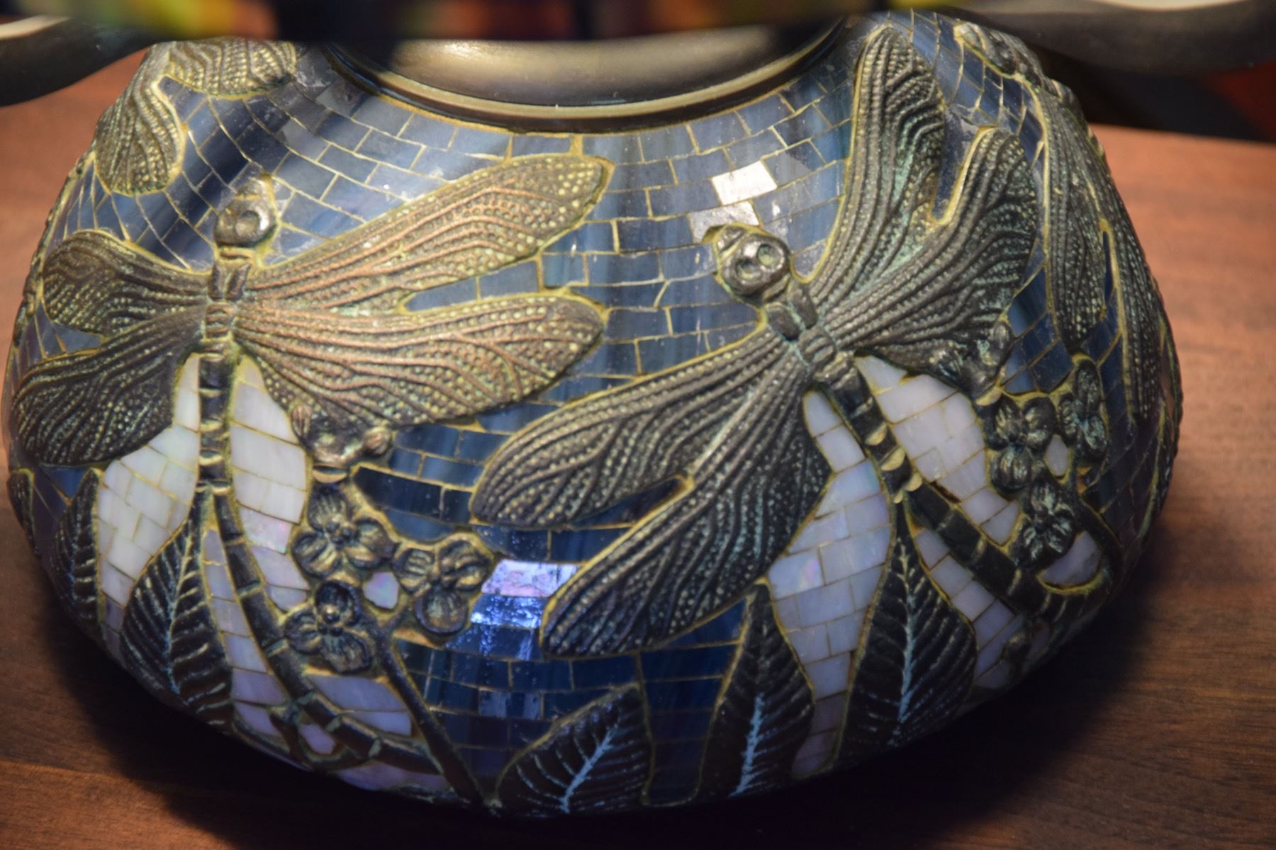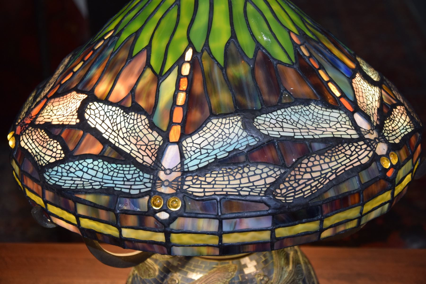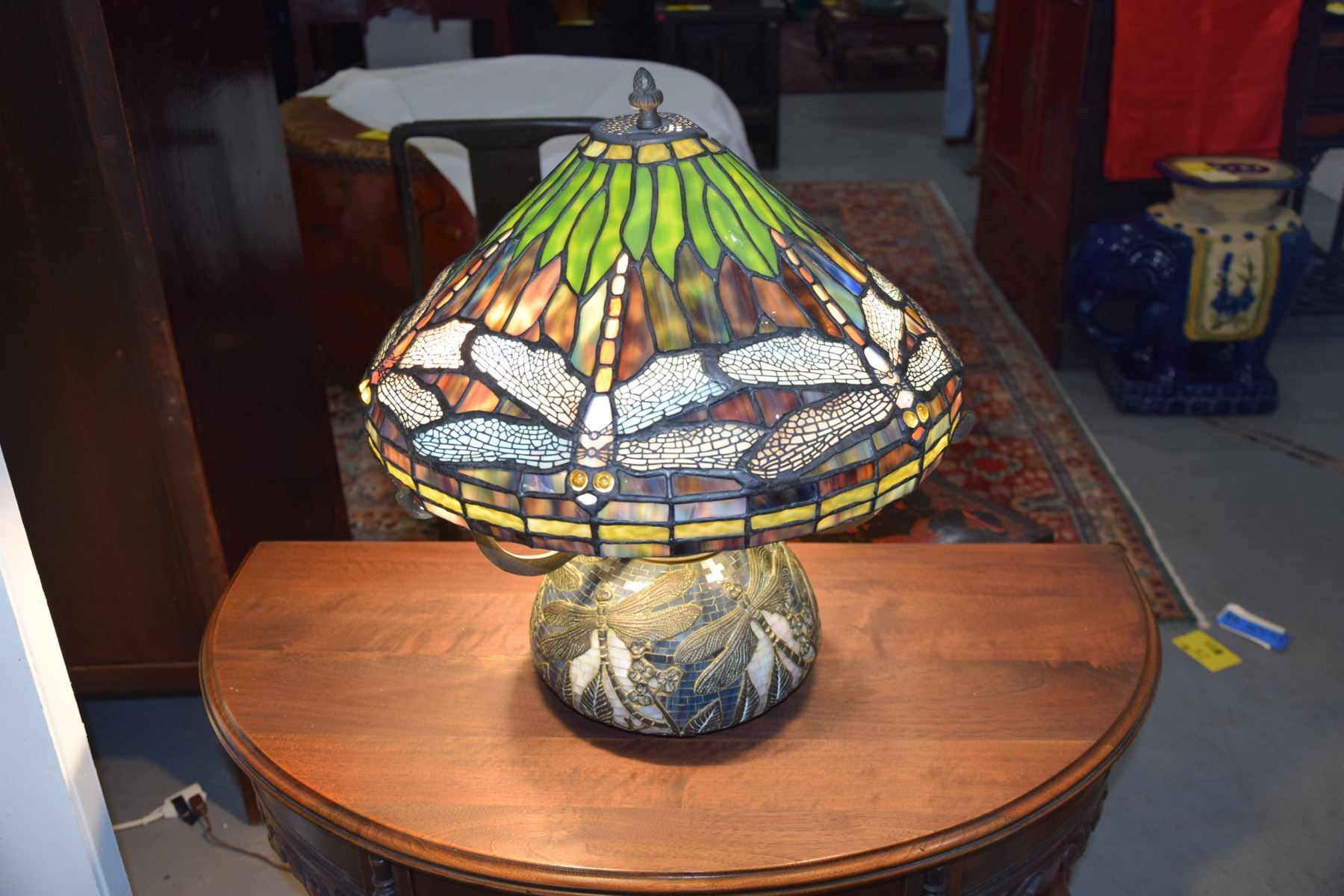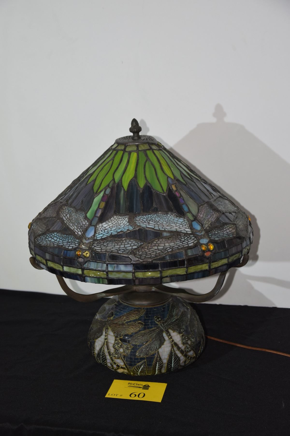TIFFANY STYLE TABLE LAMP W/DRAGONFLY MOTIF (18" X 17")