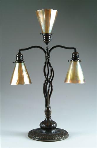 TIFFANY THREE LITE TULIP. Wonderful Art Nouveau base has naturalistic freeform foot leading to three gently curving and wrapping arms which support the wonderful gold favrile conical shades. The wonderful shades have ribbed bodies with gold iridescence showing flashes of purple and blue. Shades are signed "LCT". SIZE: Overall height is 30 in. CONDITION: Very good to excellent. 5-61472