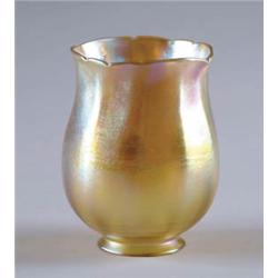 Lot 169 TIFFANY TULIP SHADE Gold tulip shaped shade gently ribbed with a nicely crimped bottom, very translucent. Signed “LCT” SIZE: 2-1/4” fitter x 4-3/4” t x 3-1/4” w. CONDITION: Very good. 5-70414