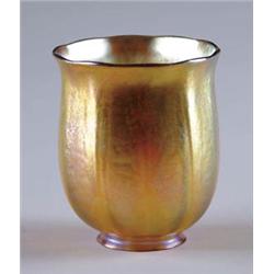 Lot 193 TIFFANY TULIP SHADE R#156. Tulip formed shade, nicely ribbed of gold Favrile glass with purple iridescence. Signed “LCT” SIZE: 2-1/4” fitter x 4-1/2” t x 3-3/4” w. CONDITION: Very good, rim appears to have been ground. 5-70439
