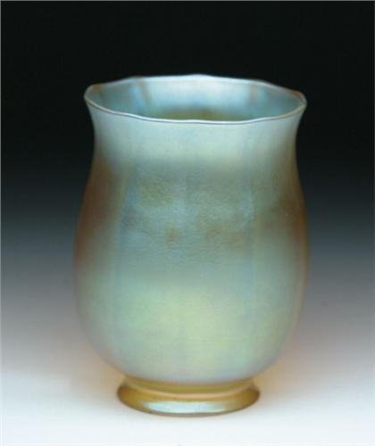 TIFFANY TULIP SHADE. Gold favrile tulip shade has lightly ribbed body with gold iridescence showing shades of lavender and green. SIZE: 5 in. t x 2-1/4 in. fitter. CONDITION: Very good to excellent. 5-61001