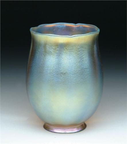 TIFFANY TULIP SHADE. Beautiful gold favrile tulip shade has shades of lavender iridescence at fitter rim as well as the entire interior of shade. Signed on fitter "LCT". SIZE: 5 in. t x 2-1/4 in. fitter. CONDITION: Very good to excellent. 5-60999