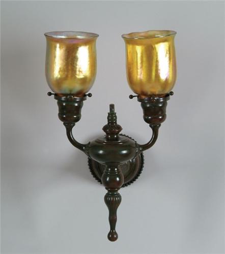 TIFFANY TWO LITE SCONCE. Beautiful Tiffany sconce has artichoke design near the wall plate with two arms extending from bulbous center to support two gold favrile tulip shades. Each shade is signed inside the fitter "LCT". Sconce fixture has rich brown patina with green highlights. SIZE: Extends 8 in. from wall. Overall height approx. 18 in. CONDITION: Fixture appears to have had a candlesnuffer and chain, which are now missing. Otherwise very good to excellent. Estate of Jon Heiden and Donald Mooers 5-60669