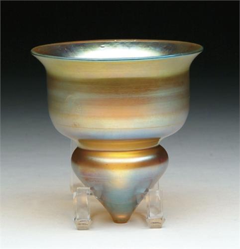 TIFFANY VASE TOP. Iridescent gold Tiffany vase top has blue and amethyst highlights. Signed on ground tip "LCT Favrile". SIZE: 4-1/4 in. dia x 4-1/2 in. t. CONDITION: Stem was broken off vase and rough bottom was ground to preserve vase bowl. Estate of Jon Heiden and Donald Mooers 5-60698