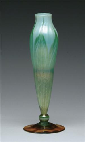 TIFFANY VASE. Gorgeous Tiffany vase has green pulled feather design extending the length of the vase against a cream colored, slightly iridescent background. Vase rests on a gold favrile applied foot. Signed on the underside "LCT W3175". SIZE: 7-3/4 in. t. CONDITION: Very good to excellent. 5-61284