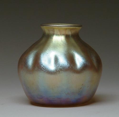 TIFFANY VASE. Beautiful gold favrile vase has brilliant gold iridescence with platinum hues. Vase has a ribbed body with dimples at the shoulder. Signed on the underside "LCT W4716". SIZE: 3-1/2 in. t. CONDITION: Very good to excellent. 5-61281