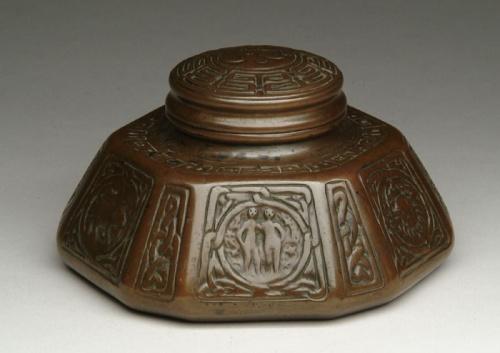 TIFFANY ZODIAC INKWELL. Wonderful Tiffany bronze inkwell has zodiac figures in medallions surrounding the inkwell as well as the middle of the hinged top. Complete with original clear glass insert. Signed on the underside "Tiffany Studios New York 1072". SIZE: 6-1/4 in. across. CONDITION: Very good to excellent. 5-61491