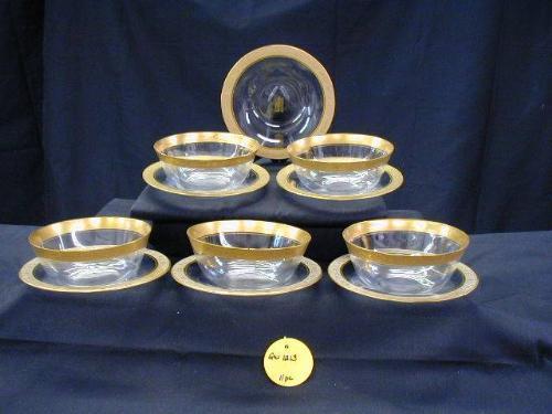 TIFFIN CO. FINGER BOWLS W/LINERS ROLLED GOLD EDGE W/ FLORAL & GEOMETRIC DESIGN INCLUDES (5) BOWLS 4 7/8inDIA. (6) 6in LINERS, 11 PC